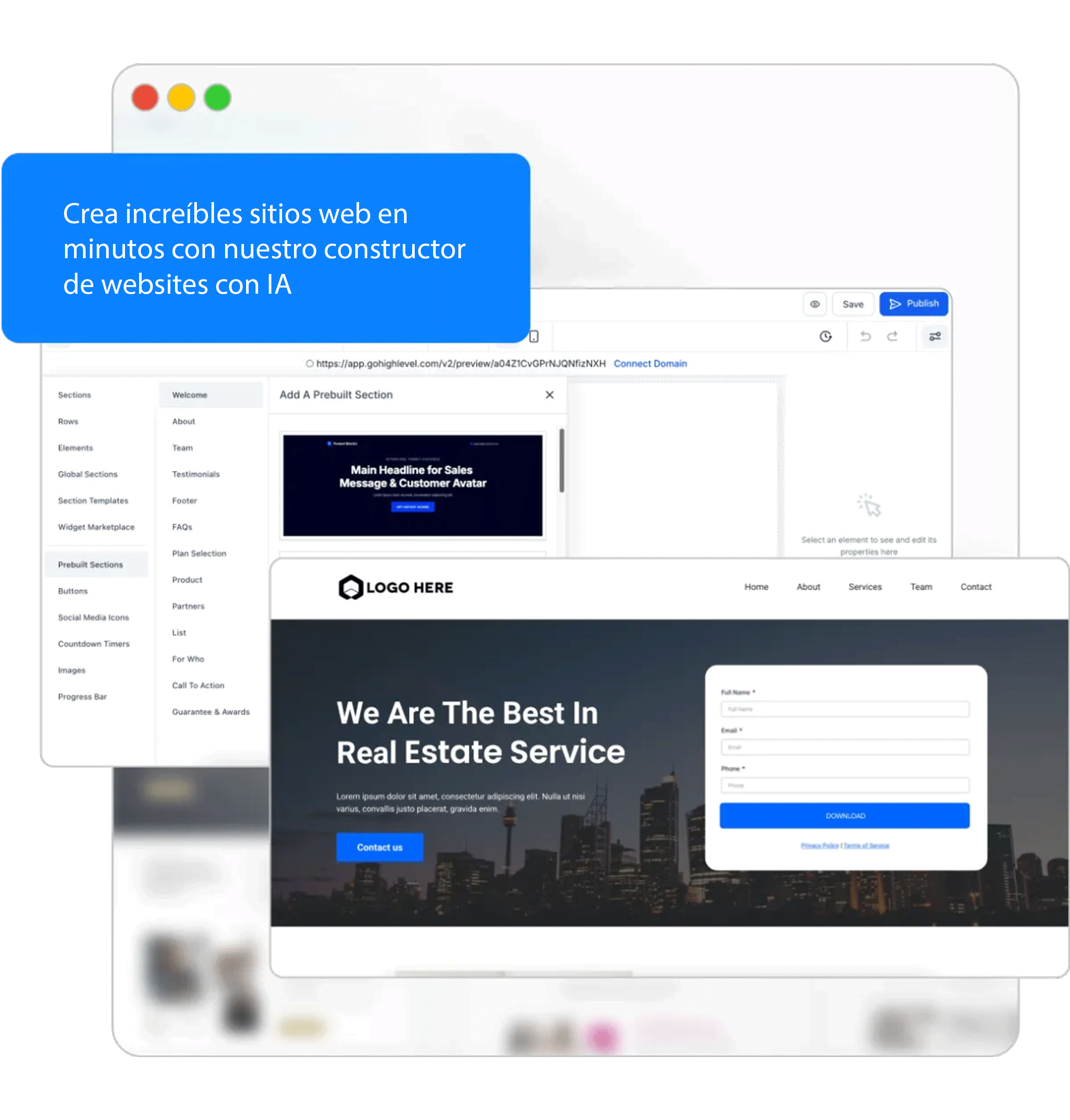 Crea sitios web, funnels y landing pages completas.